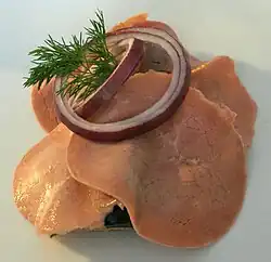 The simplest form of dyrlægens natmad consists of a slice of rugbrød with a base spread of butter or fat, a layer of leverpostej, sliced salt beef, meat stock aspic and slices of red onion on top.[2]