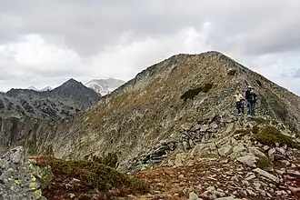 Dzhano (Bulgarian: Джано [ˈd͡ʒano]) is a 2,668 m high peak in the Pirin mountain range, south-western Bulgaria. It is located in the northern part of Pirin on the mountain's main ridge between Demirkapia Saddle and the summit of Chengelchal (2,709 m) in the south.[1] From Dzhano the main ridge turns in southern direction. To the north the short secondary ridge Dzhangalitsa leads to the summit of Sivria (2,591 m).[2] The north-eastern slopes descent to the Kremenski cirque and the homonymous lakes, to the east is the Kamenishki cirque and to the west — the Demirkapia one.[3] Seen from Popovo Lake the summit appears imposing, though lower than the peaks along the main ridge further south. The peak is built up of porphyry granite blocks and is covered in moraines.[4]