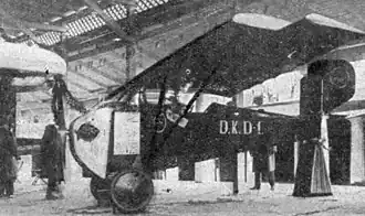 The D.K.D.1 was a high wing aircraft with an enclosed cabin for one passenger and an open cockpit for the pilot. It had a one-piece wooden wing of trapezoidal plan with an unswept leading edge, built around two spars and fabric covered. The wing was braced with V-struts from the lower fuselage longerons to the spars. The aircraft first flew with the wing centrally fixed directly to the top of the fuselage but flight testing revealed poor forward visibility from the cockpit and the wing was raised a short distance on four vertical, faired struts, allowing the pilot to look forward under the wing. There was a large, deep cut-out in the trailing edge over the cockpit. The generous balances on its ailerons extended beyond the squared wing tips.[1]