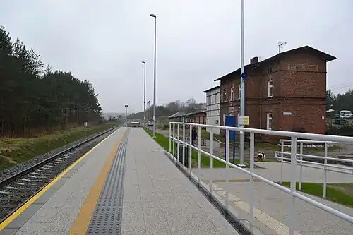 Dzierżążno railway station is a railway station in the village of Dzierżążno, in the Pomeranian Voivodeship, Poland. The original railway through Dzierżążno opened in 1886. The station was closed in 1994, when train services on the line between Pruszcz Gdański and Kartuzy ceased. Modernisation of the line and the rebuilding of the stations took place between May and September 2015. The station re-opened on 1 October 2015 and is located on the Pruszcz Gdański–Łeba railway. The train services are operated by SKM Tricity as part of the Pomorska Kolej Metropolitalna (PKM).