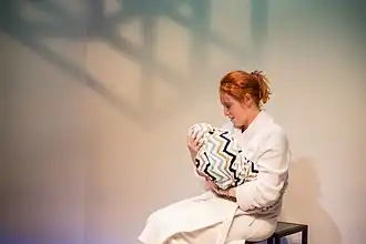 Catherine is an ex-patriate Australian lawyer living in London with her architect husband. Aged in her mid-40s and having been through 18 cycles of in vitro fertilisation treatments over 11 years, Catherine is desperate for a child and gestational surrogacy is her last chance.[1] Nellie is a 28-year old Catholic woman living in Boston, Massachusetts,[2] (where surrogacy is legal), with two children. As a lawyer, Catherine ensures that the contract formed covers various topics which Nellie had not considered. Nellie sees herself as altruistic, able to help Catherine's dearest wish for a child come true,[1] but with different backgrounds, values, and wealth, some degree of conflict is inevitable.[3] Once Nellie has become pregnant, Catherine's controlling nature causes friction and Nellie gradually asserts herself[1] – most notably when the contentious issue of selective reduction becomes relevant – and as it becomes clear that Catherine resents the experiences of pregnancy and child birth which she is missing. Nellie's maintenance of a sometimes too-honest vlog is also a source of tension.[1] As seen in the images below, the relationship comes to involve substantial conflict and tension with each displaying their worst selves, to the point where Nellie shouts at one point "I'm the one who's carrying this baby!" eliciting the cold reply "Yes. And I'm the one who's paying," from Catherine.[4] In a play where money is generally not the issue,[5] we are still reminded that surrogacy does raise issues of the commodification of human life and that differences in socioeconomic status cannot be entirely set aside.