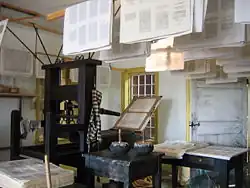 On June 26, 1829, the twenty-three-year-old Grandin announced in the Wayne Sentinel that he intended to publish the Book of Mormon "as soon as the translation is complete."[7] Oliver Cowdery prepared a copy of the manuscript, and Grandin bought "500 pounds of new small pica" type in New York. The chief compositor, John H. Gilbert, found that the manuscript was "closely written and legible, but not a punctuation mark from beginning to end."[8] Gilbert said that he added punctuation and capitalization in the evenings. Cowdery also set some type.[9] To print the book, Grandin used a Smith Improved Printing Press invented by Peter Smith (1795–1823), which first appeared on the market about 1821 and was the most up-to-date press available to the small printer of the day.[10]