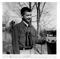 ![]() Bergstrom holding a common grackle that he had banded in his yard in West Hartford, CT in 1953. | |