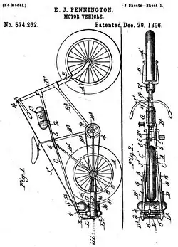 E.J. Pennington is probably best known today for his pioneering motorcycles.[3] He is sometimes credited with having invented the word "motorcycle"; he used the term as early as 1893. Pennington built and demonstrated his original motorcycle design in Milwaukee in 1895. Apparently not finding any backers for his idea he took it to England where he sold the patents for it to Harry John Lawson's The Great Horseless Carriage Company Limited in 1896 and joined that company's board of directors. Lawson had two more prototypes built[4] but nothing further came from the design. Pennington made many claims for his motorcycle, but it is doubtful if any of them are true. The design was very primitive and a few journalists of the time expressed doubts as to whether or not it would even run, though The Autocar reported in June 1896: "...although the motor required some little alteration, the speed developed was said to have varied from thirty to forty miles per hour."[5] Notable features were that the engine's cranks were connected directly to the rear axle, the cylinders had no cooling fins, and Pennington made use of balloon tires - an invention he is also often credited with.[6]
