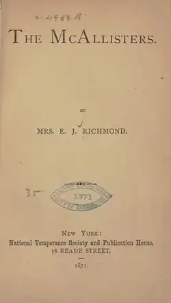 Since childhood, Richmond was interested in temperance work, and one of her early stories, The McAllisters, was a temperance[4] history based on the lives of persons known to her. The National Temperance Publication Society published that book, with her full name attached, paying for the manuscript. The book was very successful.[2]
