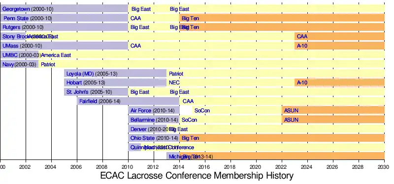 After the 2013 season, a number of members announced their intention to exit the ECAC. In late May, following a second semi-finals appearance in three years, Denver announced that they would leave the ECAC to join the new Big East Conference for the 2014 season, leaving the ECAC with six teams for that season. In early June, the Big Ten Conference announced the start of conference competition in 2015, removing Michigan and Ohio State from the ECAC after the 2014 season. In mid-June, Fairfield announced it would join the Colonial Athletic Association for the 2015 season. On July 1, Hobart announced it would join the Northeast Conference beginning immediately for the 2014 season. One week later, Bellarmine announced it would become an affiliate of the ASUN Conference (then known as the Atlantic Sun Conference) for the 2015 season.[1] Before Bellarmine's move took effect, the ASUN and Southern Conference (SoCon) announced a lacrosse alliance under which the two leagues split sponsorship of the sport, with women's lacrosse remaining in the ASUN and men's lacrosse shifting to the SoCon. Accordingly, Bellarmine played in the SoCon from the 2015 season[2] until the ASUN established its own men's lacrosse league for the 2022 season.[3] The final ECAC member, Air Force, spent the 2015 season playing as an independent before joining Bellarmine as an affiliate in the SoCon in 2016, and later following them to the ASUN in 2022.