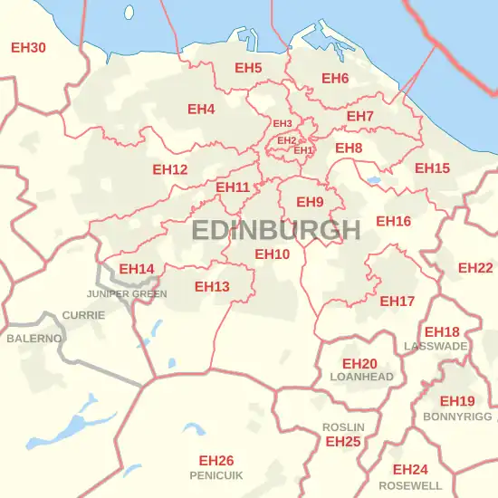 The EH postcode area, also known as the Edinburgh postcode area,[2] is a group of 55 postcode districts covering Scotland's capital city and an extensive surrounding area.