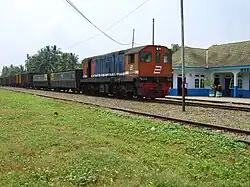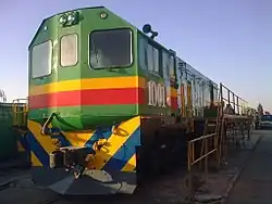 The EMD G18 is an export locomotive introduced by GM-EMD in the late 1960s. The standard EMD suffixes applied after the G18 designation to indicate if the customer purchased locomotives with specific traction motors to fit narrow gauge (U) or broad gauge (W) rails. An L indicates a locomotive built with a lightweight frame, and 6 indicates A1A-A1A trucks. The similar EMD GA18 is a G18 designed as an extremely light locomotive with low axle loading and used freight car trucks driven by a cardan shaft and underframe mounted traction motors like its predecessor, the EMD GA8. A further variation is the G18B. They are powered by an EMD 8-645E prime mover rated at 1100 bhp and 1000 hp for traction[1] and were produced with A1A-A1A or B-B trucks.