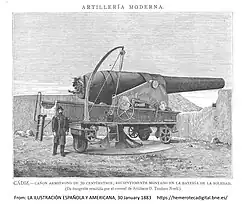 In June 1880, the EOC and the Spanish government signed a contract for a 10-inch and a 12-inch gun. Both were to be delivered in 7 months.[9][10] The price for both guns was 418,000 pesetas or 175,600 Austrian florins. The 25.4 cm gun arrived in October 1881.[11] However, in June 1882, the 12-inch gun had not yet been delivered.[9]