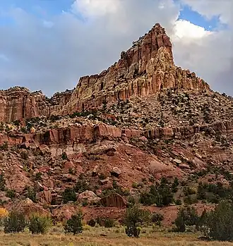 Eph Hanks Tower is composed of Wingate Sandstone, which is the remains of wind-borne sand dunes deposited approximately 200 million years ago in the Late Triassic.[4] The hard Wingate Sandstone, which tends to form steep cliffs, overlays softer beds of Chinle Formation.[5] Long after the sedimentary rocks were deposited, the Colorado Plateau was uplifted relatively evenly, keeping the layers roughly horizontal, but Capitol Reef is an exception because of the Waterpocket Fold, a classic monocline, which formed between 50 and 70 million years ago during the Laramide Orogeny.[6]