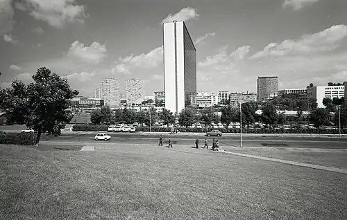 During World War II the uncompleted EUR development suffered severe damage.[6] However, the Roman authorities decided that EUR could be the basis of an out-of-town business district, which other capitals did not begin planning until decades later (for example, London Docklands and La Défense near Paris). During the 1950s and 1960s the unfinished Fascist-era buildings were completed and other new buildings were built in contemporary styles for use as offices and government buildings, set in large gardens and parks.