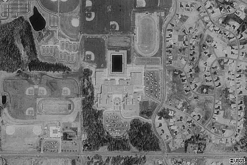 In the 1970s and 1980s, Eagan began to grow rapidly, due to the completion of I-35E, I-494 and the new Cedar Avenue Bridge.[2] During those years, high school students from Eagan who lived within the District 196 boundaries attended nearby Rosemount High School and Apple Valley High School. Both of these high schools were greatly over capacity.[3] In June 1987, Thomas F. Wilson was appointed as "Principal on Special Assignment" in charge of planning a new high school and middle school on a site that had been purchased years earlier. To save costs, the two schools were designed to share some facilities.[2] The $33 million building was designed by Hammel, Green and Abrahamson (HGA).