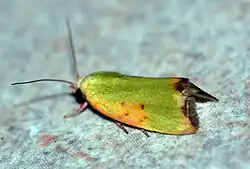 The wingspan of the adult is 21 mm. Palpi pinkish. Head and thorax pale greenish. Forewings pale green with two reddish-brown specks towards the end of the cell. Basal part of costa suffused with pinkish yellow. There is a brownish irregular marginal band with a yellowish inner edge. Abdomen and hindwings pure white.[6] The caterpillar is pale pinkish brown with olive-green speckles. Anterior tubercles are orange colored and the later are pinkish brown. There are jet-black spots above the spiracles.[7]
