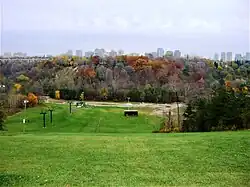 The 51 hectares (130 acres) park was built on farm land owned by John Bales, which later became York Downs Golf and Country Club in 1922.[4] The land was saved from development after the sale of the club which relocated in 1969 to Unionville, Ontario and was turned into an urban park[5] in 1975.[6] Don Valley Golf Course is located to the east and south of the park.