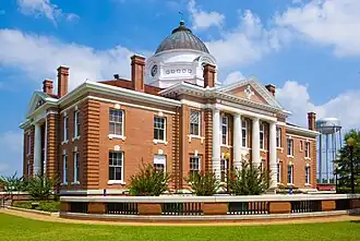 The courthouse is two and half stories and is made of brick on the exterior, with marble floors in the main public spaces.[2][6] It is in the Neoclassical (Classical Revival) style and is surrounded by smaller buildings, grass, and trees, providing a recreational space and a center for community activities.[2] The courthouse in designed a cross plan; each of the building's four facades is fronted with four rusticated Georgia columns of solid granite, which support the porticoes facing Courthouse Square.[5][6][7] The courthouse has a low dome, of the Beaux-Arts style.[5]