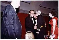 McCain also found high-level political visibility. On April 14, four returned POWs were in attendance and honored at the White House Correspondents' dinner;[202] McCain was one of them and shook hands with President Richard Nixon.[203] Then Nixon gave an address to former POWs in an auditorium at the State Department during the day of May 24.[204] McCain had undergone surgery earlier in the month for leg injuries suffered during his shoot-down,[205] and a photograph of him on crutches shaking the hand of President Nixon became iconic.[206][207] That evening, 600 ex-POWs and their families were honored at a gala dinner on the lawn of The White House.[204] The McCains became frequent guests of honor at dinners hosted by Governor of California Ronald Reagan and his wife Nancy Reagan,[208] and John McCain made a strong impression speaking at a large prayer breakfast hosted by the governor.[209] McCain had admired Ronald Reagan while in captivity and afterwards, believing him to be a man who saw honor in Vietnam service and a potential leader who would not lead the nation into a war it was unwilling to win.[210]