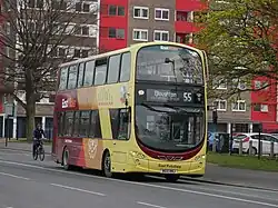 The 55 runs on Mondays to Saturdays from Hull Paragon Interchange to Gilberdyke and Goole, running parallel to the A63 and the M62 motorway and serving the communities of North Ferriby and South Ferriby, Brough, Elloughton, North Cave and South Cave, with the two-hourly extension to Goole also serving Howden.[23] The service was launched in January 2021, replacing the 155,[24][9] and is operated mainly using a fleet of refurbished Wright Eclipse Gemini 2 bodied Volvo B9TL double-deckers.