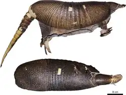 Dasypus beniensis, as in other species of armadillo, was adorned with a carapace composed of bony osteoderms which were especially rough in D. beniensis and D. pastasae. It had a long, straight tail enraptured in caudal osteoderms that formed rings around the underlying skin. The limbs were short and stout, bearing large claws and movable elbows to assist with digging. The skull is elongated with a triangular outline in dorsal view, which narrowed towards the tip of the snout. The cranium was taller topped by a cephalic shield, with a maxilla lined with small, peg-like teeth adapted for the consumption of insects and small animals.[1] In the skull, it is well-distinguished from other species of the genus which were overlooked for many years. The cephalic shield, a cap on the skull made up of osteoderms, lacks a occipital lobe that is well-formed which is usually prominent in other members of the genus. The lacrimal on the posterior part of the skull is greatly smoothed with a curve, while it is straighter in other forms. The palatine has a crest on its lateral face, while at the posterior margin it is convex. The parietals are weakly-developed and pentagonal in outline instead of broad in D. pastasae.[1][3][7]