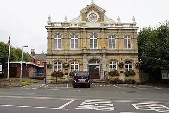 The foundation stone for the new building was laid by Mrs White on 28 May 1896.[3][4] It was designed by James Newman in the Italianate style,[5] built in yellow brick with stone dressings and was officially presented to the council by Mrs White on 25 March 1897.[6] The design involved a symmetrical main frontage with five bays facing onto York Avenue; the central bay, which slightly projected forward, featured a doorway with a fanlight flanked by stuccoed pilasters which were surmounted by acroteria; the pilasters supported an entablature inscribed with the words "Town Hall".[7] The other bays on the ground floor and the bays on the first floor were fenestrated with round headed windows with architraves.[7] At roof level, there was a parapet interspersed with sections of balustrade and broken by a central section, containing a clock, which was flanked by floral motifs and was surmounted by an open pediment.[7] The parapet was also decorated with four finials.[7] Internally, the principal room was the main assembly hall.[8]
