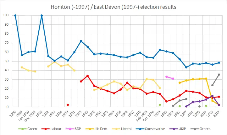 In 2015, 2017 and 2019, the seat saw an unusually strong Independent performance, by the anti-austerity candidate Claire Wright, a Devon county councillor. She won 24% of the vote in 2015, 35.2% in 2017 and 40.4% in 2019, coming second (and significantly ahead of any other candidate) each time.