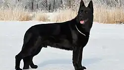 The East European Shepherd was used heavily by the military and police within the Soviet Union as a guard and sniffer dog. It was a favourite of the KGB, who only ever kept solid black examples; if a single non-black pup was born in a litter bred by the KGB the entire litter was destroyed and that breeding was not repeated.[2][3] A breed standard was approved in 1955 by the Central Committee of the USSR DOSAAF, and in 1964 by the Presidium of the Service Dog Breeding Federation.[4] The East European Shepherd is now among the most numerous dog breeds in Russia and several former Soviet countries.[3]