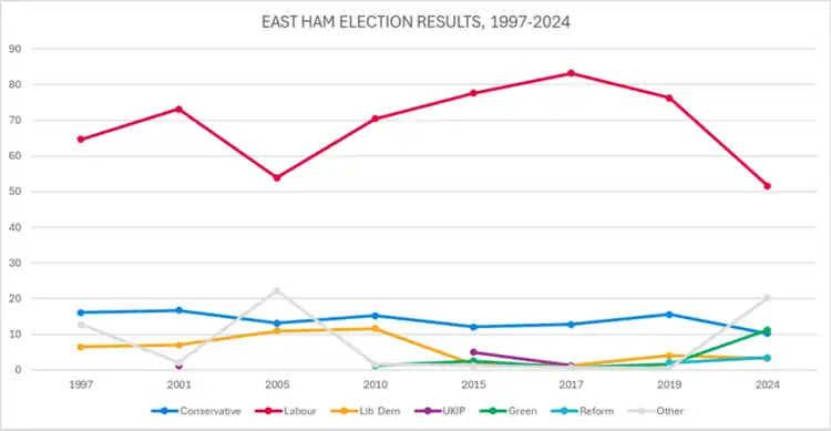 East Ham's wards have long been Labour strongholds. Ron Leighton (Lab) was MP for the old Newham North East from 1979 until his death in 1994.