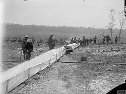 When the German spring offensive opened on 21 March, 42nd (EL) Division was in GHQ Reserve, and was ordered forward on the night of 22/23 March. It rushed up without transport and took up positions near Bapaume the following night. The signal company was unable to function properly without its transport and equipment, and had to rely on its motorcycle Despatch riders. Much signal cable that was laid was wasted by the frequent movements of HQs, and casualties were heavy among signallers repairing shelled cable. The divisional RE were kept in reserve (428th Fd Co acting as escort for the divisional artillery), but after the initial enemy advance was halted on 26 March (the Battle of Bapaume), the field companies took turns acting as infantry in the line, patrolling No man's land and taking prisoners. The division then endured the 'Great Retreat', during which the field companies were continually engaged in digging and wiring successive trench positions. The division was out of the line from 7 to 15 April, and again from 6 May to 7 June, but apart from a four-day rest the sappers were at work on defence lines during this whole time.[20][21][51][52]