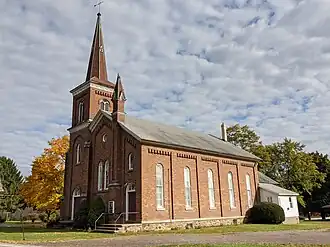East Palmyra Presbyterian Church is a historic Presbyterian church located at East Palmyra in Wayne County, New York. It is a vernacular Romanesque style brick and stone church built in 1868–1869. The front facade features a square tower composed of stone capped brick buttresses, a belfry articulated by brick pilasters and corbelled brick trim, and a tall, octagonal spire.[2]