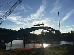 Construction of the $19 million bridge began in September 2014.[2] The Nova Scotia Government contributed $11.8 million to the project, with the remaining $7.2 million coming from the Government of Canada.[4] The contractor, Dexter Construction, poured 2,260 cubic metres (2,960 cu yd) of concrete over 650 t (720 short tons) of rebar. The new bridge relies on two pillars set in the granite below the Northeast Arm. They were built with a technique which involved drilling steel pipes into the riverbed, then surrounding them with concrete and steel, instead of installing cofferdams, which would be more costly and would disrupt the river. Near completion, a deck, railings and sidewalks, were laid.[3] It is built on the same site as the old bridge's predecessor, which was constructed in 1907.[3] Unlike the old bridge, the new bridge was designed without overhead steel arches that would have doubled the cost.[3] Overall, the structure is two metres (6.6 ft) wider than the old bridge. It includes a wider shoulder for cyclists. Several modifications were made to the roads on the Sheet Harbour side, near the bridge. Trunk 7 was aligned with what was previously Riverside Drive, which is now non-existent. Church Point Road and Pool Road were aligned to the new Trunk 7. The access road to and Duncan MacMillan High School was slightly modified. A minor loop called Sprott Lane was extended along a part of the old Trunk 7 for a few households.[2] There is no toll to access the bridge.