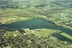 Until the mid-20th century, the East Riverside-Oltorf area remained largely rural and many vast plots of land were still deeded to the Del Valle land grant. In 1949, the Austin Country Club opened on land purchased from the Del Valle grant.[6] Golfer Harvey Penick, a teacher at the Country Club, built a small cluster of homes facing the golf course along Penick Place.[7] The land between Pleasant Valley Road and the Country Club was formerly a cattle farm owned by Fagan Dickson and Roberta Crenshaw. In 1973, the Dicksons applied to redevelop their 497 acres into a sprawling planned unit development divided into 25 sections, known as "The Crossing". The development included an extension of Lakeshore Boulevard from Pleasant Valley Road along the river to Montopolis Drive.[8] The development that came to fruition was a handful of parcels bounded by Crossing Place and Faro Drive; Crenshaw later donated 30 acres to establish Roy G. Guerrero Park and sold the remaining land to developers to construct student housing.