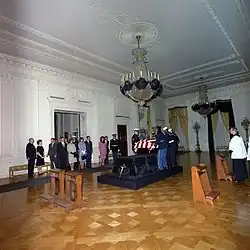 Two funerals for Lincoln Family members were held in the East Room in the 1860s. The first was that of 11-year-old Willie Lincoln, President Abraham Lincoln's son, who died of typhoid fever on February 21, 1862.[57] Just over three years later, Lincoln's body lay in state in the East Room as well, and his funeral was held there on April 19.[58]