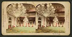 At the time of Lincoln's death in 1865, the East Room contained 24 chairs, four sofas, four tables, eight sets of drapes, eight sets of lace curtains, eight mirrors, and one carpet.[59] All the furniture was in poor shape.[60] During his administration, members of the public attending the weekly receptions in the room had heavily vandalized the room in seeking souvenirs, ripping down portions of the wallpaper and stealing cords and tassels from the drapes. Someone even cut a square yard from one of the damask drapes.[61] Others took scissors and knives to the carpet, gouging the oak floor beneath,[62] and gilded ornaments were stolen from the mantels.[60]