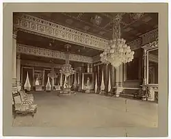 President Chester A. Arthur hired the Washington, D.C., firm of W. B. Moses & Son to redecorate much of the White House in 1881, including the East Room.[75] Moses & Son added new window curtains and drapes, and a suite of ebony furniture carved in a Japanese style. This suite included sofas, arm chairs, side chairs, and corner chairs.[76] Arthur then auctioned off an immense quantity of older White House furnishings in April 1882, including some amount of undescribed older furniture from the East Room.[75] Desiring an even grander approach to the public rooms, Arthur hired Tiffany & Co. in 1882 to redecorate the East Room yet again. Most of this work involved painting and regilding, however. No new furniture was ordered, and the over-mantel and pier mirrors reframed or regilded.[77]