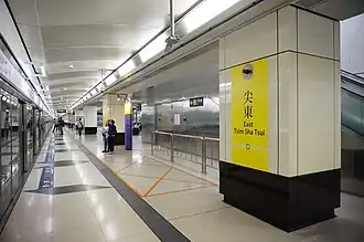 East Tsim Sha Tsui (Chinese: 尖東; Cantonese Yale: Jīmdūng) is a station of the Mass Transit Railway (MTR) system of Hong Kong. It is currently an intermediate station on the Tuen Ma line.