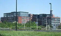 Eastern runs through what was once the heart of Toronto's most industrial area, the region just north of Toronto Harbour and the Port Lands area. Today most of the factories have departed.[2] Some do remain, notably the large Weston bakery. Several film studios have moved into the former industrial areas near Eastern and Carlaw, and this area is today billed as the Studio District. Eastern was also home to the headquarters of the Toronto chapter of the Hells Angels, until it was raided and confiscated by police in April 2007.[3]