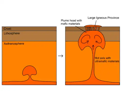 At around 2.7 billion years ago, a Large Igneous Province event with massive magmatism took place. It was caused by a mantle plume activity, which led to the stretching of the crust, the intrusion of magma and thus the melting of the lithosphere.[4][58][30] Such a model can explain the eruption of ultramafic melts and thus the generation of komatiites and mafic rocks in Luxi granite-greenstone terrane.[4][30] The axis of the plume consisted of hot ultramafic material with low viscosity, while the head of the plume brought cooler basaltic material.[58] Therefore, rocks have different chemistry.[30][4]