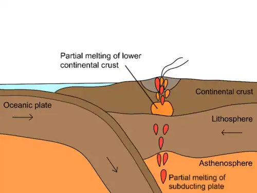 The generation of tonalitic-trondhjemitic-granodioritic gneiss is associated with the formation of the magmatic arc during subduction.[5][59][60] The geochemistry of tonalitic-trondhjemitic-granodioritic gneiss is similar to that of the calc-alkaline rocks in a continental arc under modern plate tectonics.[5][59][60] Within the continental arc system, the subducting oceanic plate and lower continental crust were partially melted.[5] As a result, there is a slight difference in the composition of tonalitic-trondhjemitic-granodioritic gneiss. Some have a higher content of magnesium, whereas others have lower.[5]