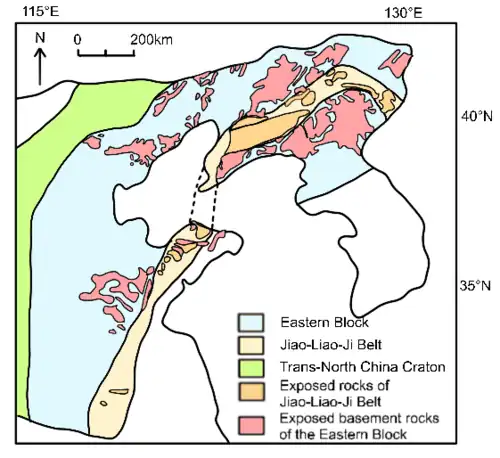 - ^ a b c d e Li, Sanzhong; Zhao, Guochun (September 2007). "SHRIMP U–Pb zircon geochronology of the Liaoji granitoids: Constraints on the evolution of the Paleoproterozoic Jiao-Liao-Ji belt in the Eastern Block of the North China Craton". Precambrian Research. 158 (1–2): 1–16. Bibcode:2007PreR..158....1L. doi:10.1016/j.precamres.2007.04.001. ISSN 0301-9268.