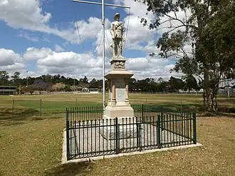 The other major feature of the park is the war memorial that is situated at the corner of Brisbane Road and Jordan Street. It comprises a square granite base supporting a pedestal of white Helidon sandstone and a life-sized statue of a Digger in marching kit above crossed British and Australian flags. Pilasters of brown sandstone with Corinthian capitals separate recessed marble plaques on each face of the pedestal. These bear the names of 22 volunteers from the district.[1]