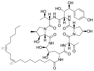Echinocandin B, a lipopeptide, is a naturally occurring cyclic hexapeptide with a linoleoyl side chain. It belongs to a class of antifungal agents called echinocandins, which inhibits the synthesis of glucan, a major component of the fungal cell wall, via noncompetitive inhibition of a crucial enzyme, β-(1→3)-D-glucan synthase. Echinocandin B is a fermentation product of Aspergillus nidulans and the closely related species, A. rugulosus;[1] discovered in 1974 in A. nidulans var. echinulatus strain A 32204 in Germany,[2] it was the first of the echinocandin class of antifungals.