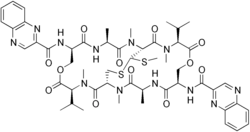 Echinomycin is a bis-intercalator peptide and is biosynthesized by a unique nonribosomal peptide synthetase (NRPS).[2][3] Echinomycin is isolated from various bacteria such as Streptomyces lasalienis. It belongs to a family of quinoxaline antibiotics. There is great interest in this group of compounds because they have very potent antibacterial, anticancer, and antiviral activities.[4]