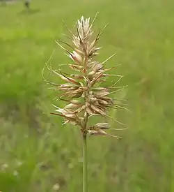 Echinopogon caespitosus, the bushy hedgehog grass or tufted hedgehog grass, is a species of grass native to southeastern Australia. It is often found in disturbed areas. The original specimen was collected at Katoomba railway station in 1931, and published in Icones Plantarum in 1934 by Charles Hubbard. The grass may grow to 1.5 metres, and is noticeable due to its dense, bristly head. The specific epithet is derived from Latin, meaning tufted.[1][2]