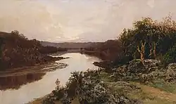 At this distance, however, the aspect of the country begins rapidly to improve. The forest is less thick, and the trees in general are of another description; the iron barks, yellow gums, and forest oaks disappearing, and the stringy barks, blue gums, and box trees, generally usurping their stead. When you have advanced about 4 mi (6.4 km) further into the interior, you are at length gratified with the appearance of a country truly beautiful. An endless variety of hill and dale, clothed in the most luxuriant herbage, and covered with bleating flocks and lowing herds, at length indicate that you are in regions fit to be inhabited by civilized man. The soil has no longer the stamp of barrenness. A rich loam resting on a substratum of fat red clay, several feet in depth, is found even on the tops of the highest hills, which in general do not yield in fertility to the valleys. The timber, strange as it may appear, is of inferior size, though still of the same nature, i. e. blue gum, box, and stringy bark. There is no underwood, and the number of trees upon an acre do not upon an average exceed thirty. They are, in fact, so thin, that a person may gallop without difficulty in every direction.[15]