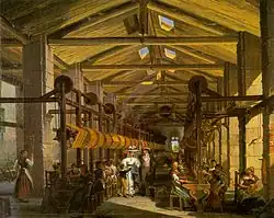 Investment in the roads fostered the development of industry, in 1835 there were 117 woolen mills,[54] the Lefebvre and Polsinelli paper mills, employing over a thousand workers.[50] The development of mechanical engineering activity lagged behind, with the development of activity by privately owned industries such as the Marcy and Henry, the Zino and Henry Works, the Guppy and Pattinson, Royal Ironworks and Mongiana Workshops, and above all, of the publicly owned Pietrarsa Workshops, which constituted the largest industrial complex in Italy.[34]