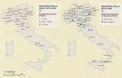 The urban patriciate, composed of large landowners, helped revitalize the agrarian sector but at the same time caused manufacturing production to decline; the region's economy underwent a profound transformation, now directed toward the export of agricultural products and semi-finished goods, such as raw and twisted yarns.[27]