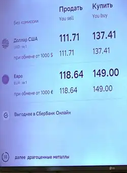 The Russian ruble fell to record lows as Russians rushed to exchange money.[233][234][235][236][237] The Moscow and St Petersburg Stock Exchanges were suspended.[238] The Central Bank of Russia announced its first market interventions since the 2014 annexation of Crimea to stabilize the market. It also raised interest rates to 20% and banned foreigners from selling local securities.[239] The sanctions put Russia's sovereign wealth fund at risk of disappearing. Long lines and empty ATMs have been reported in Russian cities.[240][241]