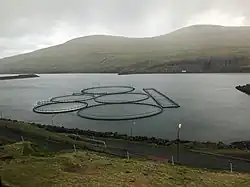 In 2014 the Faroe Islands had a trade surplus of 401 million DKK,[21] a figure that rose to 1.43 billion DKK in 2016.[22] As of 2016, the Faroe Islands mainly imported goods from Denmark (2,467 million DKK), Germany (877 million DKK), and Norway (610 million DKK).[8] The country's top export destinations were Russia (1,907 million DKK), the United States (898 million DKK), the United Kingdom (851 million DKK), and Denmark (697 million DKK).[6] European Union countries constituted 72.9% of total Faroese imports, while the exports of the Faroe Islands were more equally distributed between European Union (44.4%) and non-European Union countries (55.6%).[22] The vast majority of Faroese exports, around 90%, consists of fishery products.[14][23] Russian countersanctions on food imports from Norway and the European Union, saw the Faroe Islands increase its fresh salmon exports to Russia.[24][25][26] The Faroe Islands has a free trade agreement with Iceland since 2005.[27]