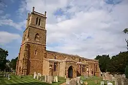 The Church of England parish church of Saint Mary Magdalene is just off the High Street. It dates from the 13th century.[5] Graves of the Sotheby family of Ecton Hall and the Franklin family are in the churchyard. The stained glass in the east window of St Mary Magdalene's Church is dedicated to the memory of Major General Frederick Edward Sotheby of Ecton Hall. It depicts The offering of King David at the Cave of Adullam, and was executed in 1912 by Percy Bacon & Brothers.[6]