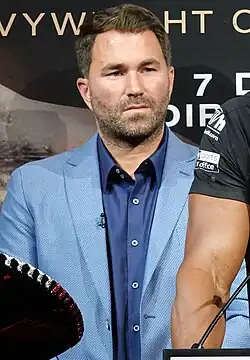Edward John Hearn (born 8 June 1979) is a British sports promoter and the chairman of Matchroom Sport and Professional Darts Corporation.[2] Hearn has promoted many world champion boxers through Matchroom, including Anthony Joshua, Canelo Álvarez, Gennady Golovkin, Vasyl Lomachenko, Katie Taylor and many others.[3][4] He is the son of promoter Barry Hearn, the founder of Matchroom Sport.