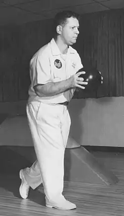 Eddie Lubanski (September 3, 1929 – November 8, 2010) was an American bowler whose competitive career spanned more than four decades, and whose achievements entered the Guinness book of World Records. He was named Bowler of the Year in 1959, and later served as bowling instructor and president of the Professional Bowlers Association. He was inducted into the Michigan Sports Hall of Fame, ABC Hall of Fame, Polish American Sports Hall of Fame and City of Detroit Sports Hall of Fame.[1] He had the highest lifetime average of 204 for over 25 years. On June 22, 1959, he bowled two consecutive 300 games.[2] The event was televised from Miami and paired him with a female bowler. He bowled and if he did not strike, she would attempt a spare pick-up. She would bowl until she missed a strike. Lubanski bowled strikes for two games and she never attempted a spare. The following year, Lubanski (768) teamed with fellow Detroiter Bob Kwolek (814) to establish a world record doubles total of 1582.[3]